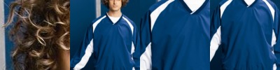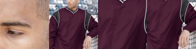- Self-fabric collar and raglan sleeves with contrast-color inserts