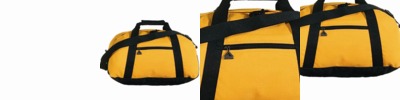 Water-resistant duffel with black web handles and self-fabric wrapper reinforced at stress points.
